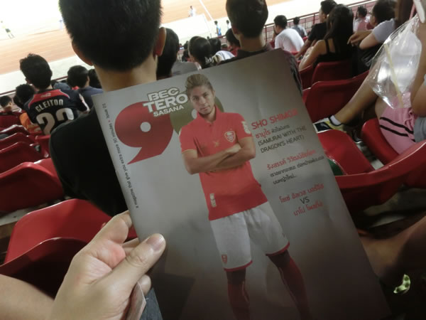 メインスタンドでプログラム付きの席(180バーツ)です。プログラムの表紙は下地奨選手。でも、スタメンではなくベンチでした。背番号もこれを見て9番かと思ったのですが、16番でした。