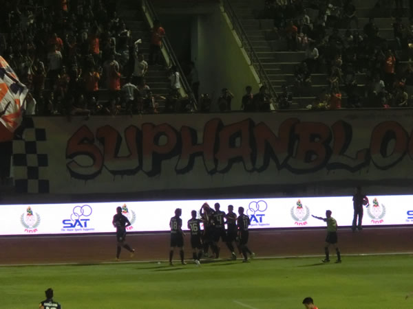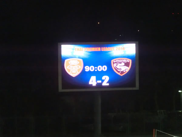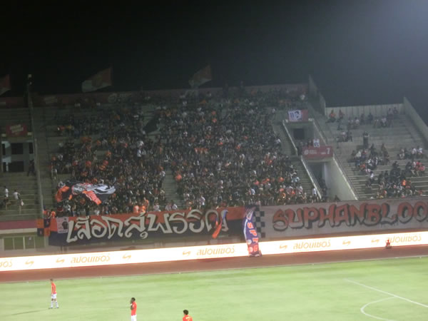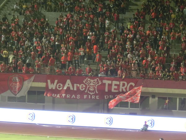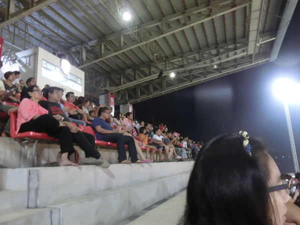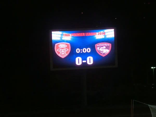 ゴール裏には座席がなく、メインスタンドとバックスタンドのみの構造。スタジアム自体は比較的新しく(以前は、バンコクの度中心のナショナルスタジアム駅の目の前にある、テパサディン・スタジアムがホームでしたが、新スタジアムにホームが移っています。)電光掲示板も、昨日のタイジャパニーズスタジアムと比べても性能が全く違っていましたね。