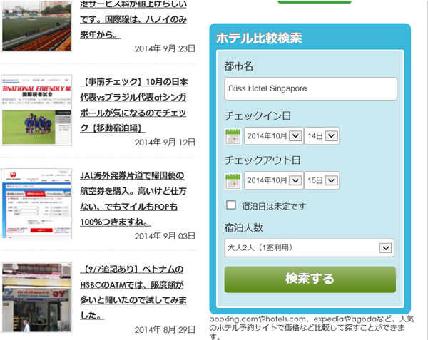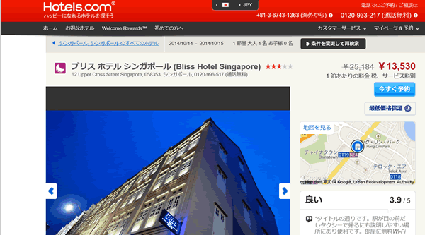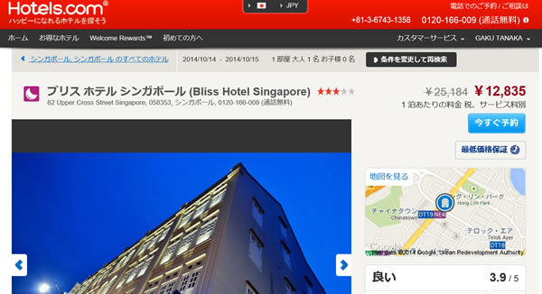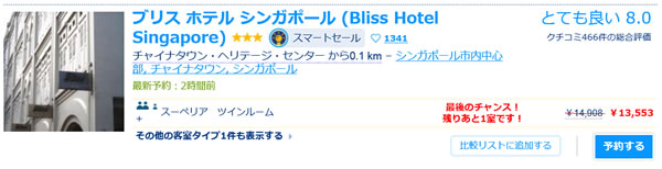 Bliss Hotel Singaporeというところです。今は、ホテルサイトでホテルごとのレビューがあるので、良い評価と悪い評価を総合して、平均くらいになるところを選んでいます。