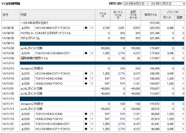 9月からのマイル実績明細ですが、帰国日が変更になって、片道のみ海外発券で取ることになったホーチミンシティ-東京間のチケットの片道のみでの6489FLY ONポイントが結構効果的でしたね(まあ、安いチケットではないので、結果的に、得をしたとも言えないのですがw)