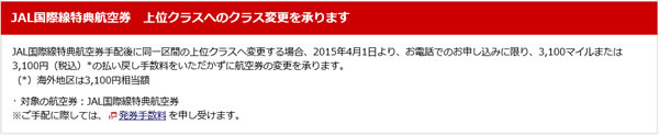 JAL国際線特典航空券 上位クラスへのクラス変更を承ります・・・これは、電話で手数料なし(通常は、3100マイルか、3100円)でアップグレードできます的な扱いのようですが、結局、電話で変更することにより、発券手数料で2160円取られるので、「何がお得?」という気もしますが、こういう変更がある方にとっては、お得な点も多いのかもしれません。