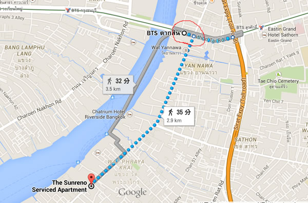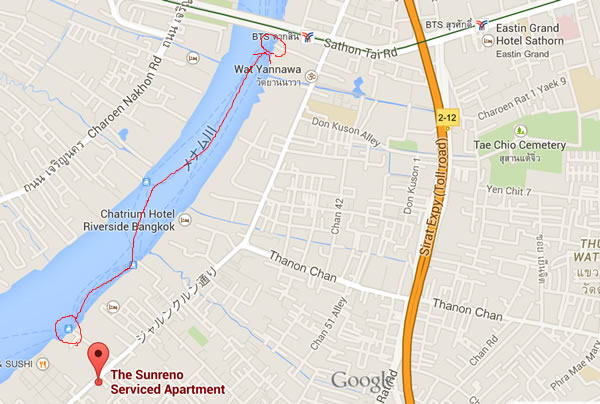 ただ、上記の地図でホテルと大きめの○がアジアティークでその隣にお寺があるのですが、その奥にチャオプラヤエクスプレスの船着場があります。ここから、15バーツで10分ほど行くと、サトーン船着場(Tha Sathorn)があり、そこからすぐが、BTSのサパーン・タークシン駅(Saphan Taksin Station)があります。