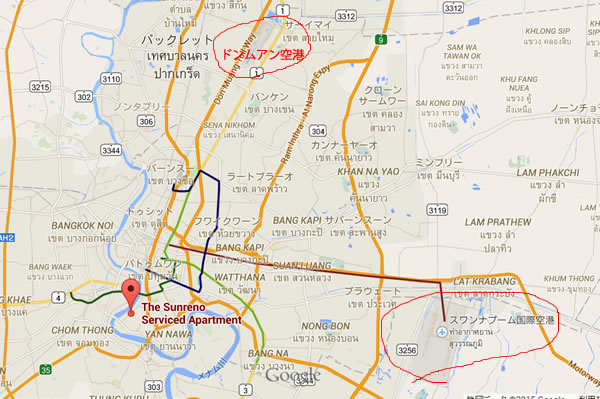 ちなみに、空港からのアクセスにおいて、距離で言うと、バンコク中心地に行くよりも遠くなります。しかしながら、以下の地図を見てください。