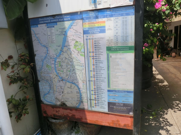 ホテル側とは反対側になりますが、チャオプラヤー・エクスプレスの乗り場の看板があります。ホテル側から反対側に渡るのが怖いという方は、船着場方面へ少し歩くとセブンイレブンのところに歩道橋(写真の奥に見えます)がありますので、そこから渡ってここまで来るのが良いですね。