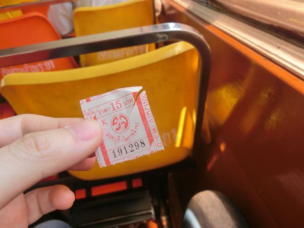 1日に多く利用する場合は、事前に1日券を購入した方がお得らしいですが、今回は、サトーンまで行き歩いてホテルに戻るだけなので、船内で係りの人からチケットを購入しました。15バーツですね。