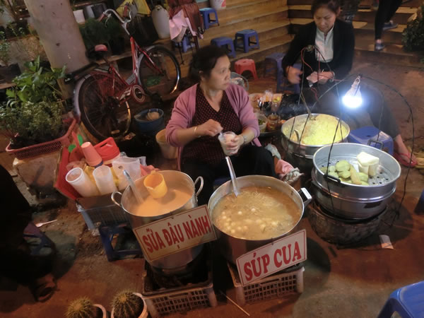 ガイドブックなどでは、それを出す店などが紹介してあるところもありますが、夜の涼しくなってきた頃に、ダラット市場を歩いていると上記のように、露店で売っていたりします。SUA DAU NANHが、豆のジュースです。