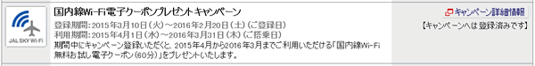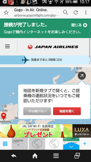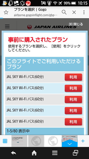 あまり画面キャプチャを取らなかったのですが、離陸して、シートベルト着用サインが消えたあとで、wifiをオンにして、JALにつなぐと、無料で使えるコンテンツもありつつのJALのページが開き、wifiを利用する場合には、クーポンがない場合には、手続きが必要になりますが、既にこのクーポンを持っている場合は、その項目を選択すると、JAL SKY Wi-Fiパス(60分)の残り分が表示され、これを利用して無料で利用することができました。