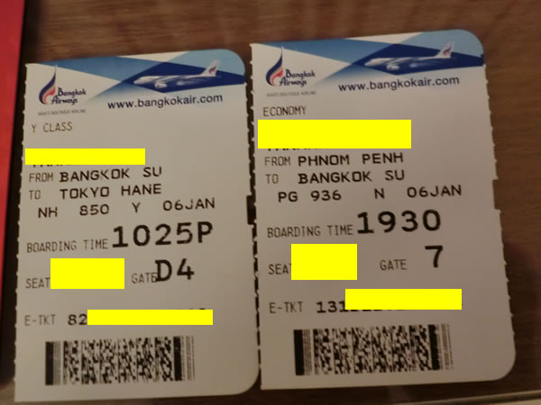 ANAに変わった航空券と、既にチェックイン時に遅れることが決まっていたことを示すバンコクエアウェイズの航空券の半券を記念に写真載せます。