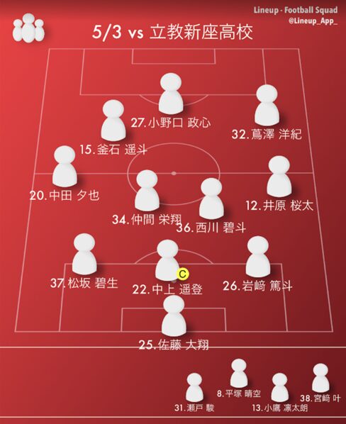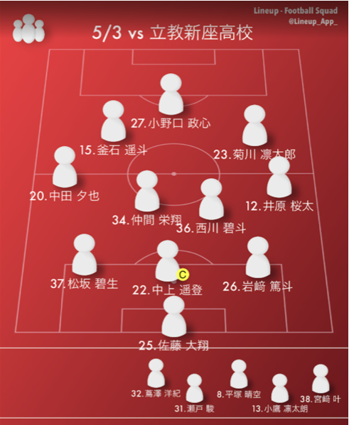 後半開始:31番瀬戸 駿、8番平塚 晴空、13番小鷹 凛太朗、38番宮﨑 叶 ⇨ 15番釜石 遥斗、12番井原 桜太、27番小野口 政心、36番西川 碧斗