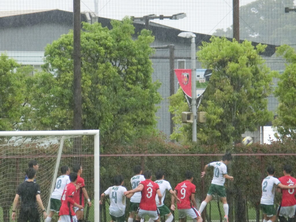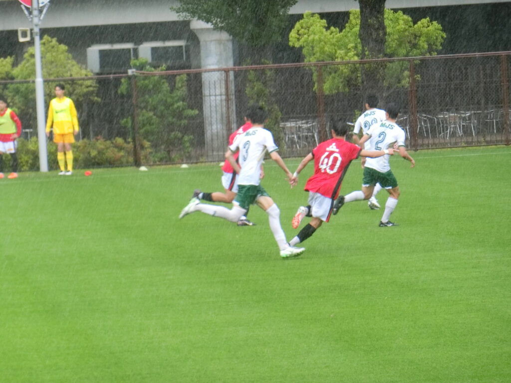 前半0-0で終えて、比較的良い印象でハーフタイムを迎えた時に過ったのが、埼スタ第4グラウンドの川崎フロンターレU-18戦の時のように前半手応えからの後半に失点したパターンがあり、実際に(後半の失点の場面が、ほぼ前方の傘で見えなかったので、失点の形がわかりませんでしたが、、)、後半早々の失点があり、難しい展開になりそうな気配と、失点後に、雨が強くなってきたりで、リードしているチームがやりやすい展開にまたなってしまうのかと思わせるところもありましたが、そのさらなる悪天候下で、逆に徐々に浦和がペースを作り出すことに成功し、得点の場面につながるわけですね(6番安藤 純和を起点に中盤を経由して、前線の40番中村 虎太郎がペナルティエリア内でキープしてPK獲得という流れだったはず)
