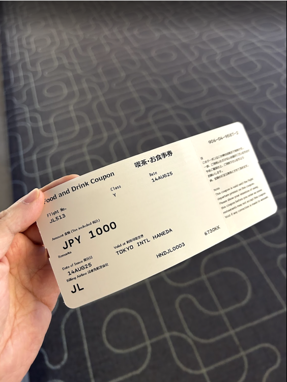 まず、この大会を目指してJALで8月14日に札幌入りしたという方は、多くの方が体験していると思うのですが、機材の関係でこの日の札幌行きの便の多くが1時間ほどの遅延ということで、空港でチェックインする際に、1000円分の食事をできる券をいただきました。