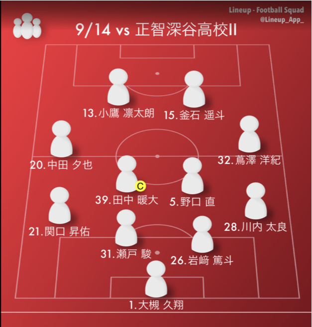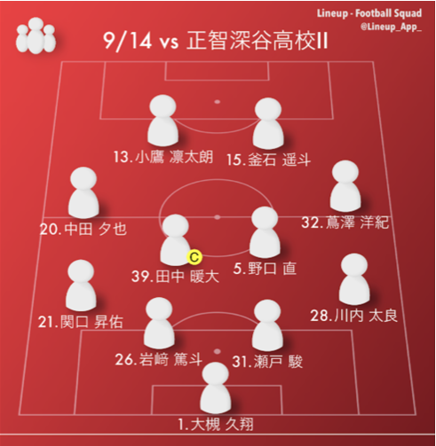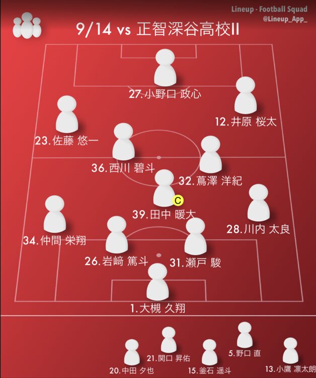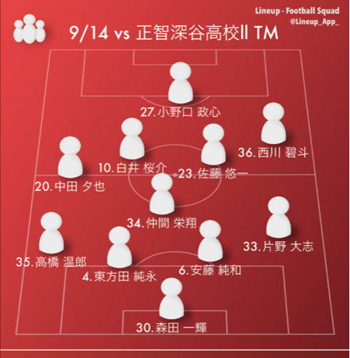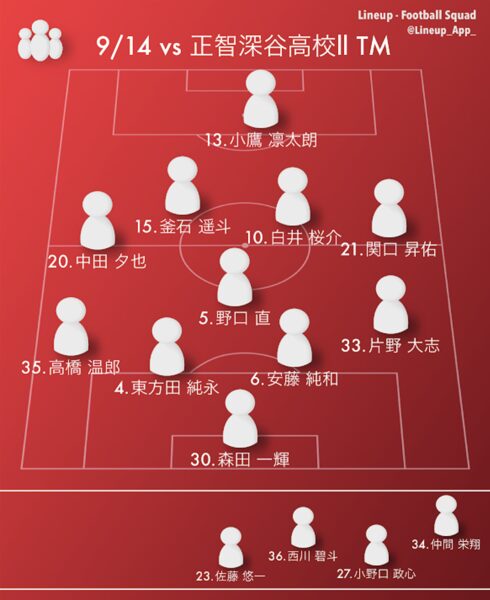 後半開始:21番関口 昇佑 ⇨ 34番仲間 栄翔、20番中田 夕也 ⇨ 12番井原 桜太、5番野口 直 ⇨ 36番西川 碧斗、13番小鷹 凛太朗 ⇨ 27番小野口 政心、15番釜石 遥斗 ⇨ 23番佐藤 悠一