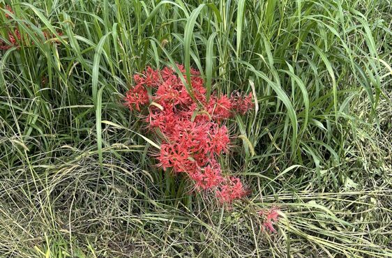 いったん、クッションとして、行きに駅まで歩いた際の土手に咲いていた彼岸花の写真を載せておきます。
