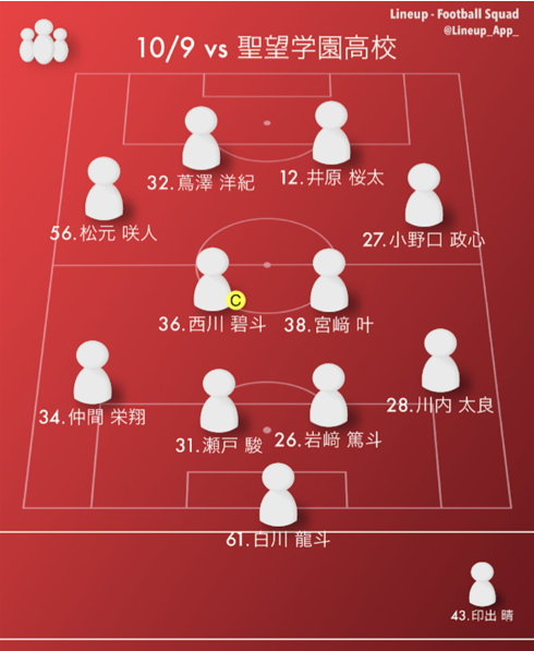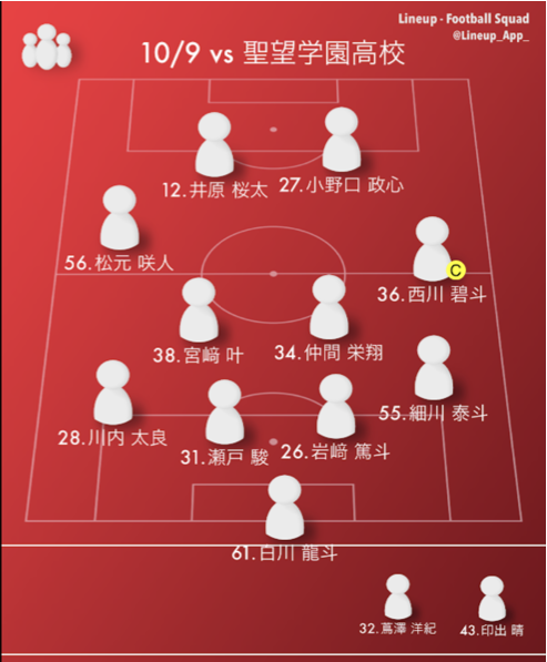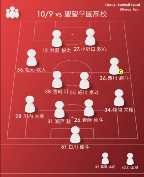 試合開始2分ほどでセットプレーの流れからの失点というスタートになったものの、その後前半15分あたりで36番西川 碧斗(訂正:38番宮﨑 叶のゴールでした)のゴールで追いつくと、そこからは、得点ラッシュ