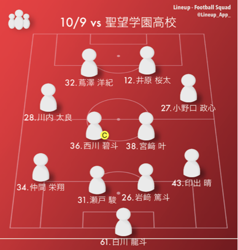 得点(浦和レッズユース):38番宮﨑 叶(前半14分)、12番井原 桜太(前半23分)、12番井原 桜太(25分)、32番蔦澤 洋紀(前半29分)、12番井原 桜太(前半30分)、32番蔦澤 洋紀(後半2分)、26番岩﨑 篤斗(後半6分)、38番宮﨑 叶(後半12分)、38番宮﨑 叶(後半20分)、27番小野口 政心(後半31分)、56番松元 咲人(後半34分)