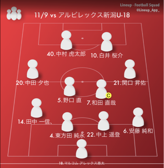 と、浦和のゴールを先に書いたところで試合の全体的な印象からすると、正直なところ試合開始から、個々のコントロールのミスが多かったり、味方同士の連携面で合わない場面が多く、少し私はフラストレーションを感じながら見てしまっていましたが、同時に、対戦相手のアルビレックス新潟U-18の連携やスムーズな攻撃の形を見ながら、試合前には何も調べておらず、気になって調べてみたら、プリンスリーグ北信越で現在首位とプレミア昇格へ向けて勢いに乗っているチームなのですね、納得です。