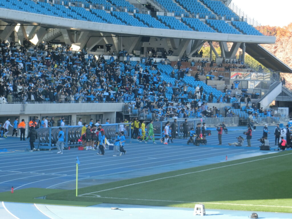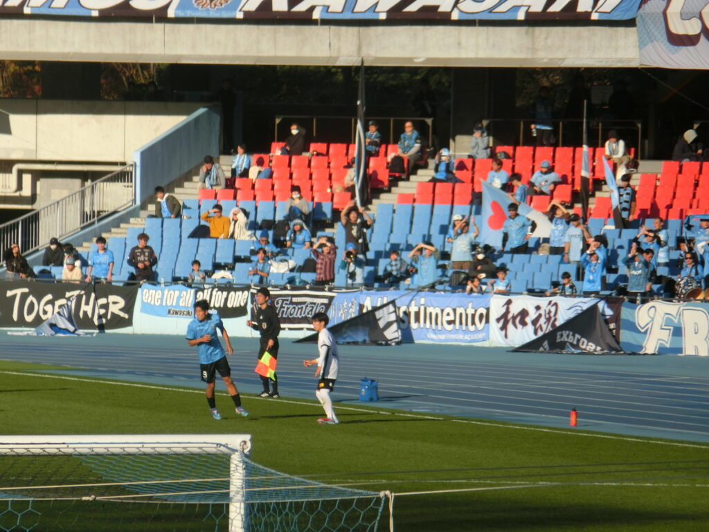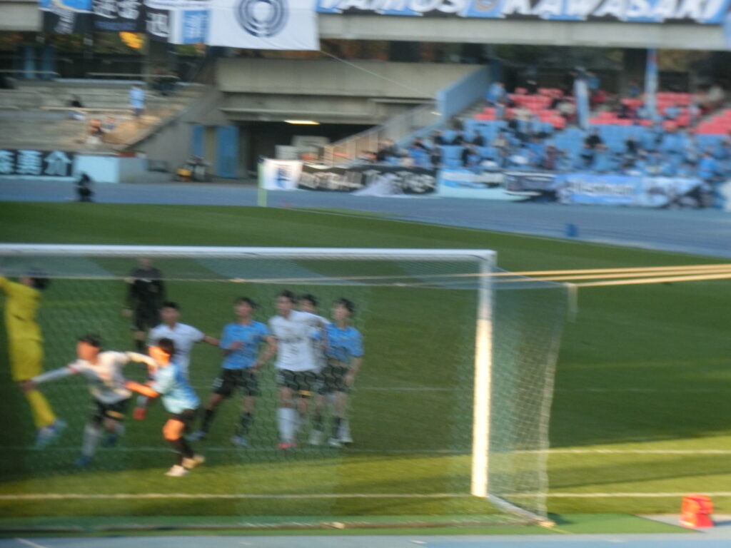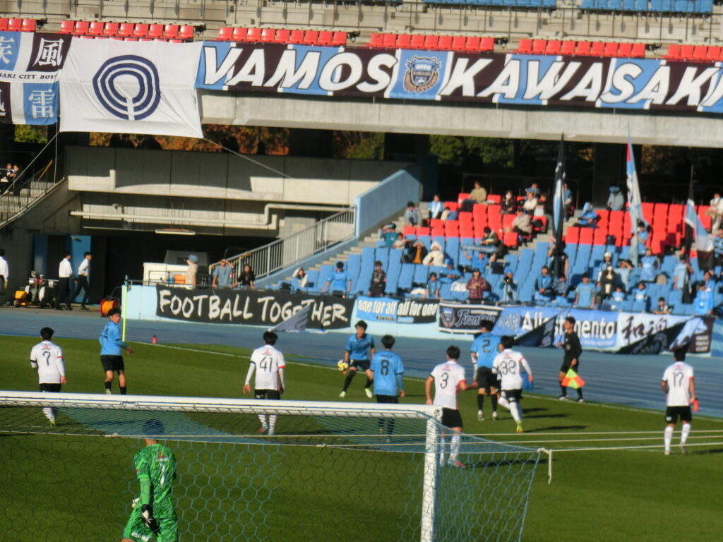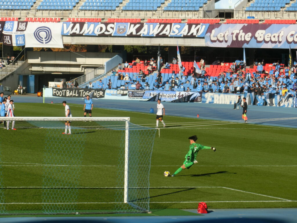 等々力陸上競技場でユースの試合を観戦するのはだいぶ昔の話(当時のフィンケ監督がユースの選手を視察に来ていた、浦和レッズではだいぶ珍しいトップの監督が育成の選手をしっかり見ようとしてくれた一時期だったのですごく私としては記憶に強く残っている)、また、一度、早慶戦で浦和レッズユース出身の新井純平と小坂慎太郎が所属していた時に足を運んだのも結構前、直近で2018年の高校サッカー(角田涼太朗が前橋育英高校にいた頃)なので、だいぶ久しぶりであり、この試合は、川崎フロンターレ側が5000人を入れるような形(そんな入らないだろうと思っていたものの、実際3000人は超えていたのですよね)で、エスコートキッズもあり、相手の応援はトップのような応援だったり、なかなかの力の入れようでしたね。