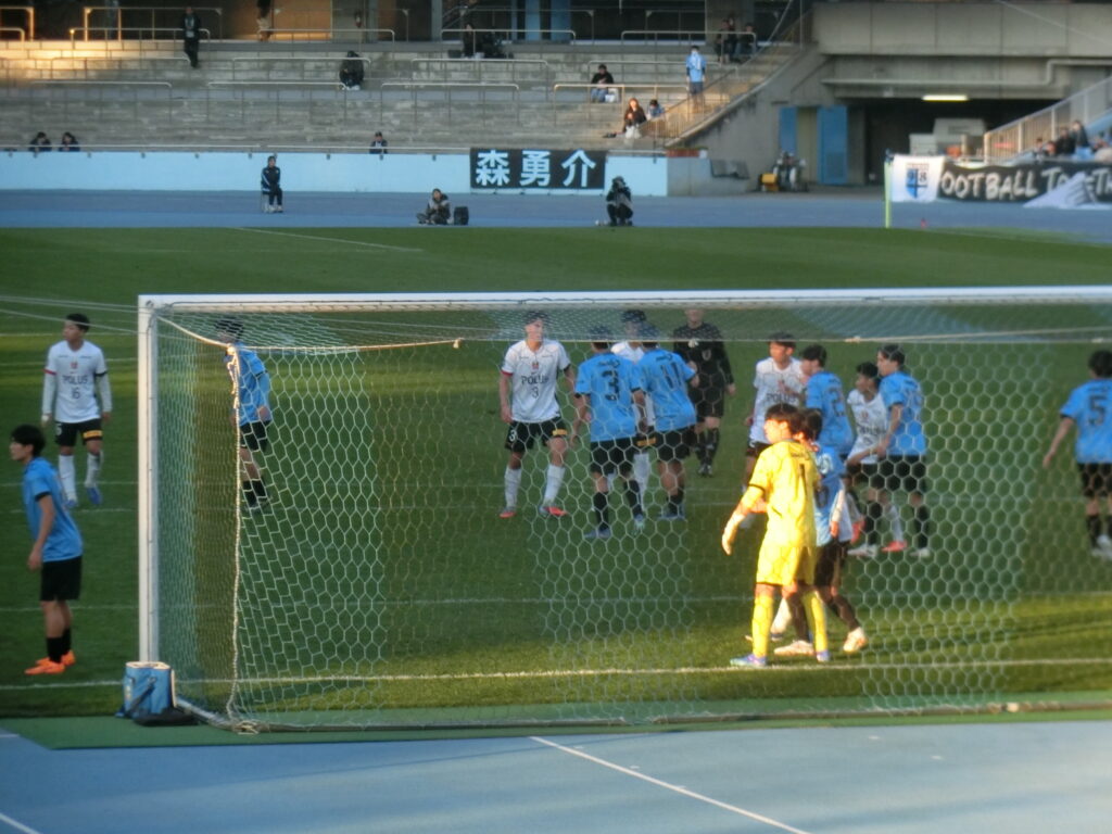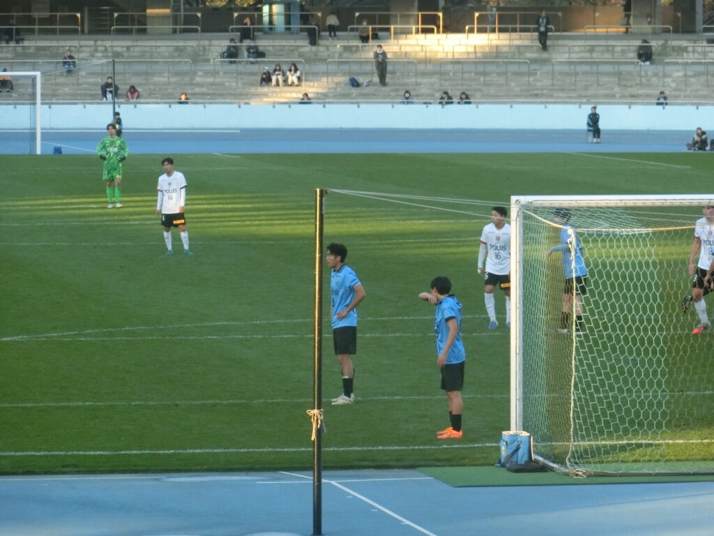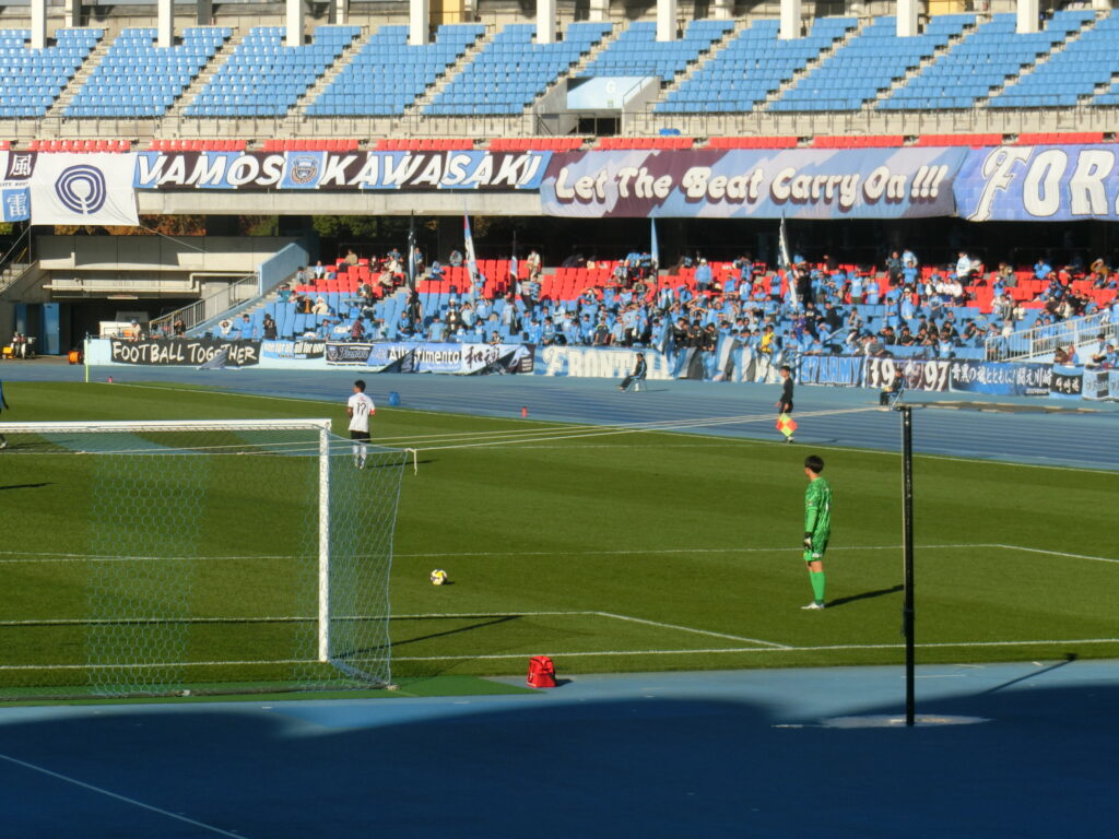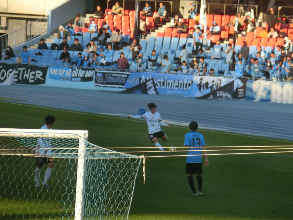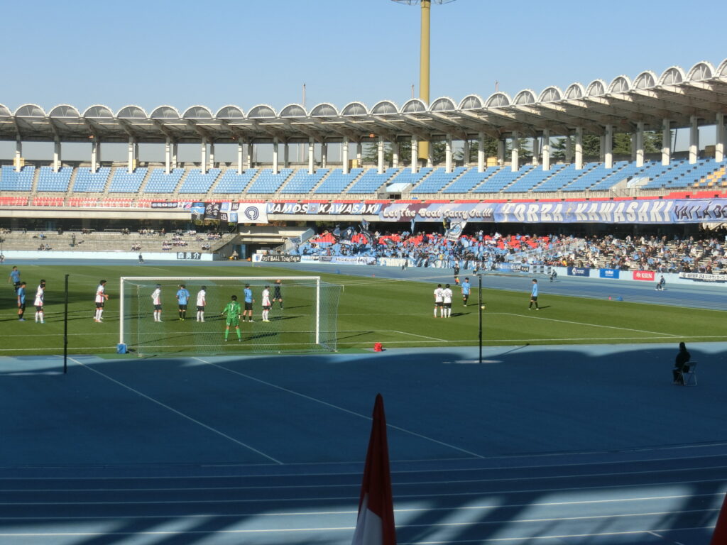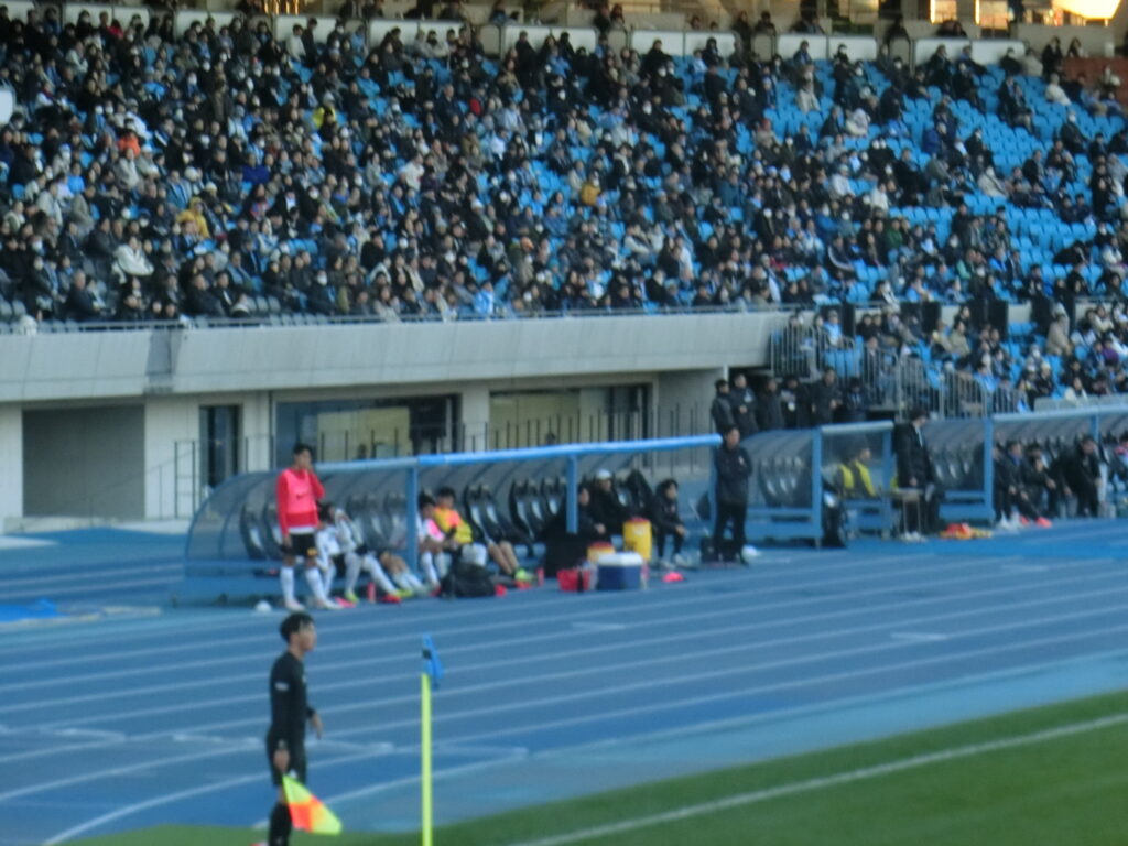 等々力陸上競技場でユースの試合を観戦するのはだいぶ昔の話(当時のフィンケ監督がユースの選手を視察に来ていた、浦和レッズではだいぶ珍しいトップの監督が育成の選手をしっかり見ようとしてくれた一時期だったのですごく私としては記憶に強く残っている)、また、一度、早慶戦で浦和レッズユース出身の新井純平と小坂慎太郎が所属していた時に足を運んだのも結構前、直近で2018年の高校サッカー(角田涼太朗が前橋育英高校にいた頃)なので、だいぶ久しぶりであり、この試合は、川崎フロンターレ側が5000人を入れるような形(そんな入らないだろうと思っていたものの、実際3000人は超えていたのですよね)で、エスコートキッズもあり、相手の応援はトップのような応援だったり、なかなかの力の入れようでしたね。