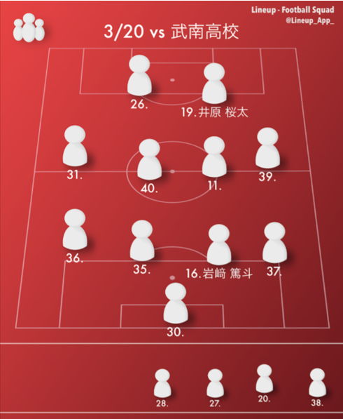 そんな中、この時期のユースのサポーターとしての試練というか、新2年生、新3年生に関しては、昨年1年間見てきたので番号と顔や動き方などで確認ができたものの、新1年生に関しては、昨年のジュニアユースは夏のクラセン3試合と埼玉県U16リーグに参加していた選手を夜の試合で何試合か見ただけなので、ほぼ誰が誰だか把握できず、尚且つ、外部からの新1年生が入ってくると、もう試合を見る前にテンパってしまうわけですね、そういう試合でした。