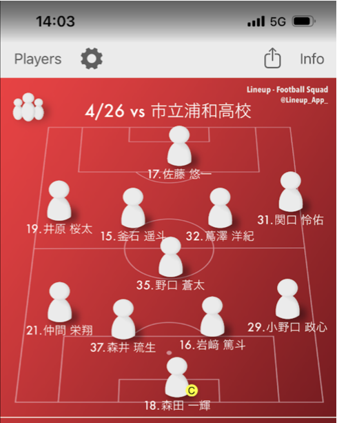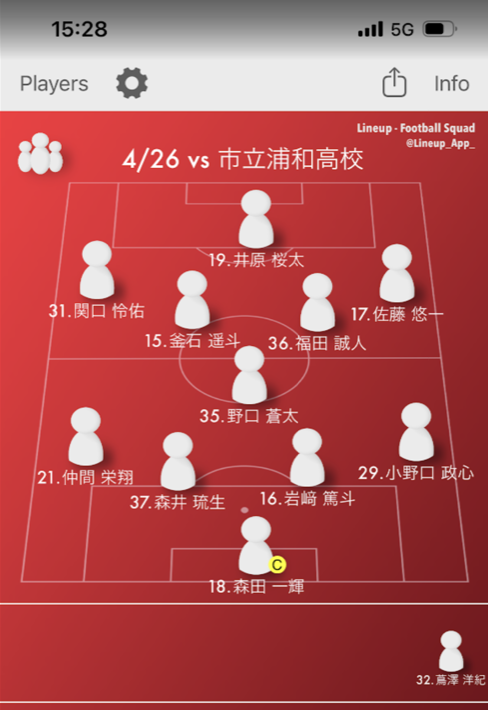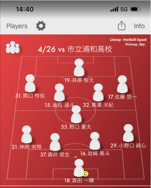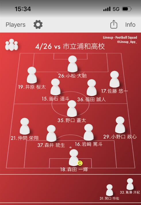 スターティングメンバー(交代や失点の時間に関しては、まだ浦和レッズの育成の公式サイトに結果が出ていないため、以下のスクショを撮った表示されている時間の数分前以内くらいとお考えいただければと思います、確認でき次第修正や追記はします。⇨修正更新済み)