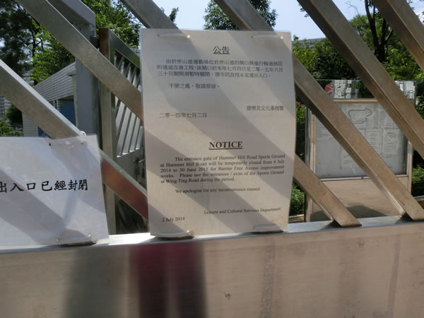 | 2014年10月19日にスタジアム訪問しました。 ウォン・タイ・シンのホームグランドとなる、斧山道運動場ですが、スタジアム訪問で、注意すべきワードが「山」とか「丘」とか、上り坂を連想させるようなスタジアムに行く場合。 googleマップなどで見て、駅からの距離が近くても、過去、この山という名前が入ったスタジアムで苦しめられたことがあります。なので、凄くアクセスは良さそうなスタジアムでしたが、上り坂に警戒しつつ向かいました。まあ、予想通り、上る感じにはなったのですが、思ったほどではなかったです。念のため、スマホのナビゲーションでスタジアムを指定して進んでいた時には、グラウンドの入口がやや遠いところに設定されていて、思ったより時間がかかるように出ていたのですが、最短距離でのスタジアムサイドから入れましたので、実際に出ていた時間よりもかなり短縮。おそらく、10分もかかっていないと思います。 | |