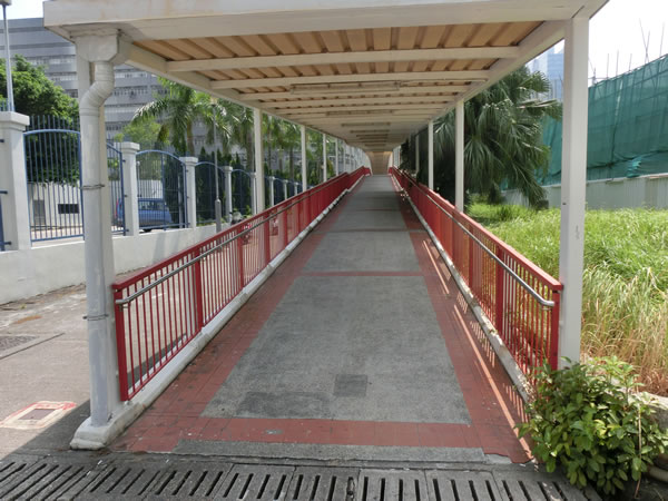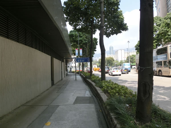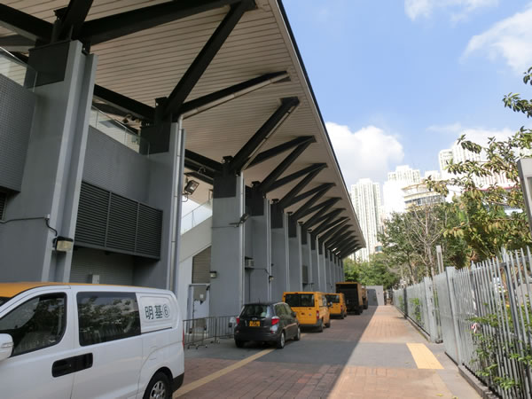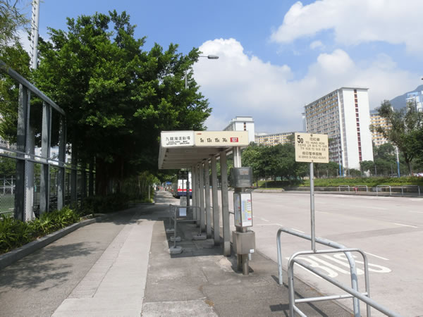バス停があります。左は、フットサルグラウンドで、右の道を渡った側には、九龍湾運動場があります。バス停名は、九龍湾運動場ですね。