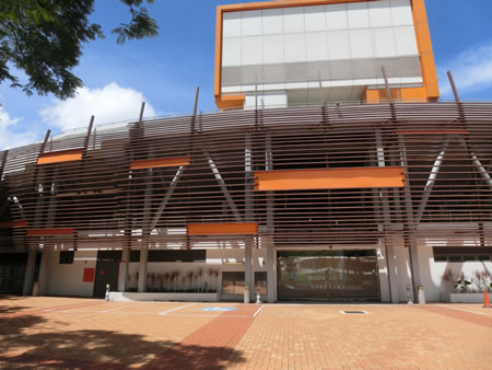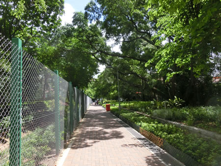 ■更にスタジアムを周っていくと、フラワーマーケット通りに続く細い道がありますが、この写真で言う右がスタジアム、左側は、バードガーデンになります。小鳥のさえずりが聞こえるので、すぐにわかると思います。
