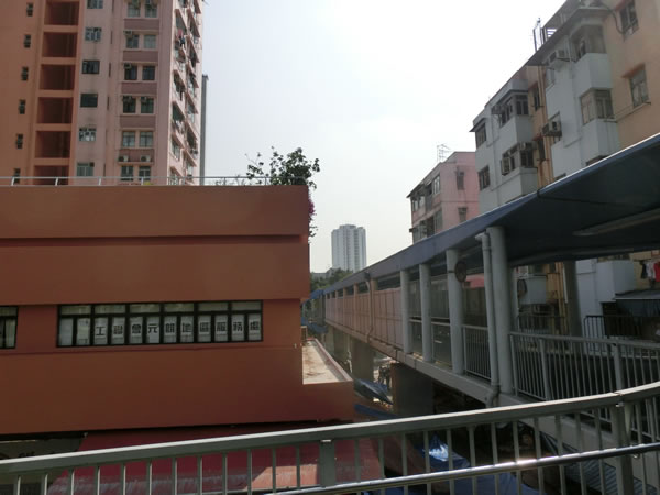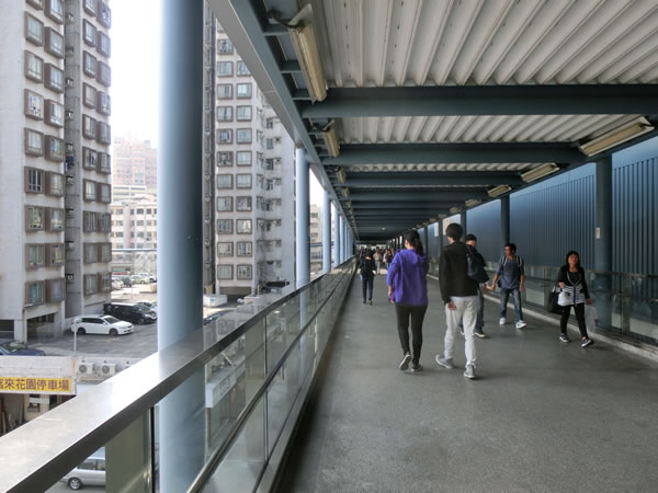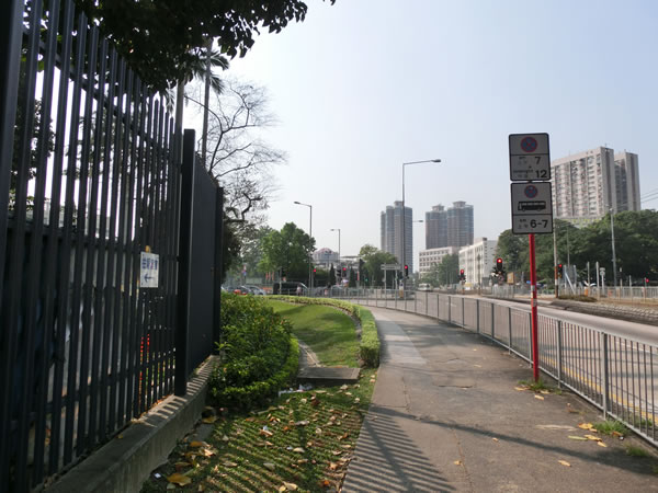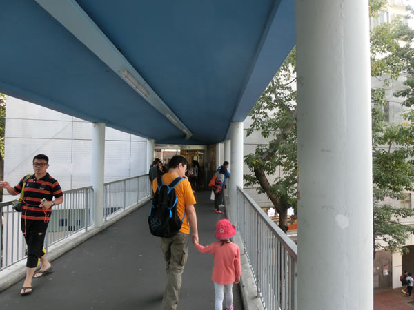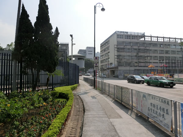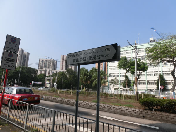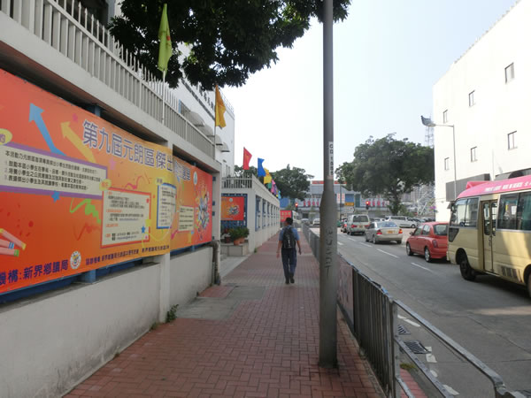 デパートを抜けると、歩道橋の下あたりが、路面電車の駅になっていたりします。そこを越えると歩道橋の最終地点で右側から降りると、ちょうど前に警察署の建物があります。この建物を越えたあたりで、目的地の元朗大球場が見えてきます。