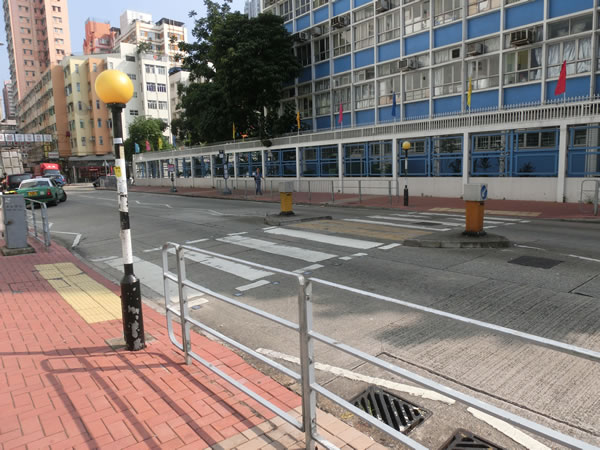 結局、警察署の裏側あたりでようやく横断歩道が出てきます(先ほどの横断歩道を降りたところの写真で左に行った場合は、突き当たって右折して、少し歩けばこの横断歩道です。)