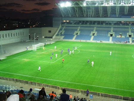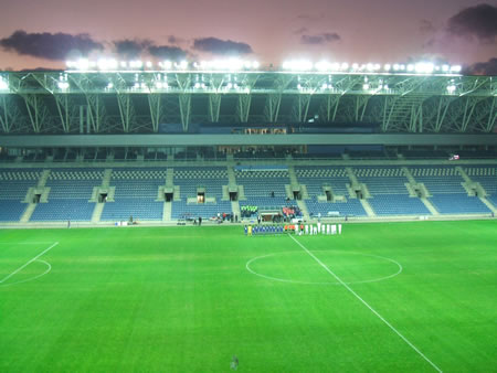 | U18日本代表のイスラエル遠征の最終戦となるU18イスラエル代表との試合で訪れました。基本的に鉄道駅最寄りで建設されたスタジアムが少ないイスラエルの中で、テルアヴィヴの中心から電車で20分ほどでたどり着くチクヴァ・キリャト・アリイェという駅の目の前にあるという最高の立地条件(旅行者にやさしい)で今年完成した新しいスタジアムになります。一緒に行った方の話では、ベンヤミナという駅が最寄でそこで降りた感じだったのですが、駅の英語表記見たらTikva Qiryat Arye Stationでした。でも、この駅ガイドブックには乗っていない・・・、駅名がスタジアムに合わせて変わったのか、新しい駅なのか、調べきれていませんが、大まかな場所はあってますし、駅名はTikva Qiryat Arye Stationで合ってます、はい。