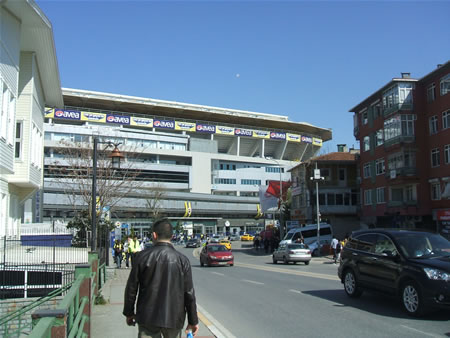 | スタジアムまでの道のり | 最寄り駅は書きましたが、観光で来る方は基本的にイスタンブールのヨーロッパ側から入ってくる場合が多いと思います。 その際はエミノニュからカドゥキョイ行きの船に乗り、カドゥキョイの桟橋(近くに国鉄ハイダルパシャ駅がある)から徒歩でも十分行ける距離ですし、実際試合の日にはこの付近を歩いているフェネルバフチェサポーターはたくさんいます。 エミノニュの桟橋から徒歩で行く場合は桟橋を背にして路面電車が走っている大通りをひたすら歩き、牛の銅像のようなもので分かれ道を右斜めに入って道沿いに歩いていくとスタジアムが見えてきます。 |