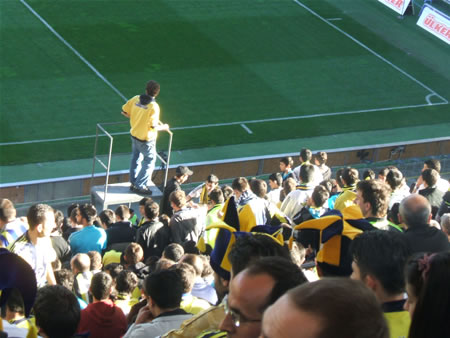 ■ゴール裏の客の入りは早く、コールリーダーが台にたって周りを煽ります。このときは一人でしたが、試合中は4人くらいがこの台に乗って周りを煽ります。
