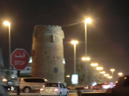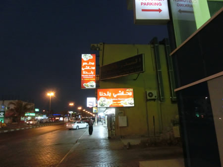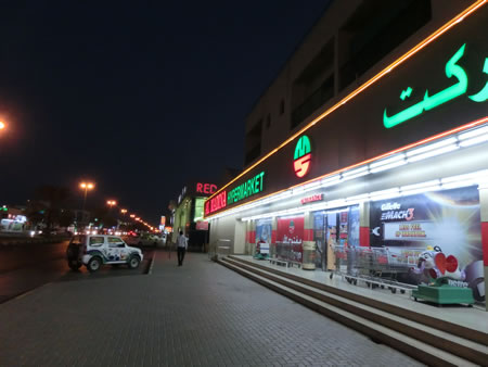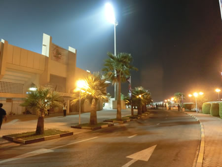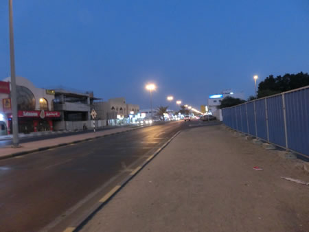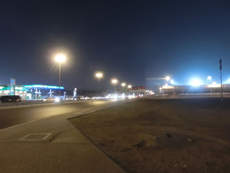 ■スタジアム周辺に来ると、まだ開発中のところが多く、まあ、砂漠のままのところも多いです。この写真の右の明るい光を放っているのがスタジアム。左手に見えるのがファーストフードのサブウェイとガソリンスタンドです。