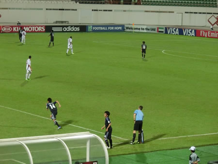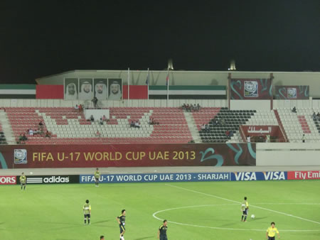 | 2013年10月のU17ワールドカップでのU17日本代表のグループステージ2試合を観戦。ドバイなどのように、公共交通機関で鉄道網などが発達していない国では、一つのホテルを拠点にして動くのがスムーズ。ブクメは、ラヤン・ホテルRayan Hotel Sharjah(google map)を拠点に動きました。 シャルジャで宿を探した際に比較的安く、スタジアムへも2キロほどなので十分徒歩圏内になります。ドバイからでも、タクシーで30分ほどで着きますが、ドバイ-シャルジャ間のタクシーの乗り入れの際には、20ディルハム追加されますので、目的地がシャルジャで数日用事があるという場合であれば、シャルジャで宿を確保したほうが、良いと思います。 物価もシャルジャとドバイでは、思った以上に違いますので、シャルジャで買い物したほうが何を買うにしても安いです。ドバイからタクシーを利用した際は、シャルジャ市内での渋滞を避けたいタクシー運転手が、シャルジャに入ったところで20ディルハム追加したあたりのところで、シャルジャの友人の運転手を紹介して、乗り換えて移動をお願いされるケースが多かったです。トータルの金額では変わりませんが、乗り換える手間はあります。 ここで、がっついて乗り換えたくないと主張するかどうかは、乗る人次第ですね。シャルジャに入ってからの渋滞を考えると、運転手の気持ちもわかります。トータルでは、50~60ディルハムくらいになると思います(タクシーにより、シャルジャに入るところで自動的に20ディルハム追加されるところもありますし、清算のところで、初めて金額に追加されることもあります。この区間を移動してメーターの金額が安すぎる時には、清算の時に追加されると考えてください。) 今年1月に訪問した、アル・アイン同様に2,3キロくらいのところに手ごろでしっかりしたビジネスホテルがあります。そこからほぼ一直線の道を徒歩での移動も可能です。アル・アインの場合は、道のりに店らしい店は、ほとんどありませんでしたが、シャルジャの今回利用したラヤン・ホテルからの道のりでは、University Roadを歩いて行く途中に、様々な店があります。 スーパーマーケットも2件ほどありますし、大衆食堂的な食事ができる場所も何軒かあります。床屋が5件ほど連続している場所など、不思議なところもあったり、ホテル近くには、ゴールドセンターというキラキラしたものが売っている店もあります。 スタジアムまで来ると急に周りに店が少なくなりますが、スタジアムからUniversity Roadを渡って少し行ったあたりに日本でもおなじみのファーストフードのサブウェイがあります。 スタジアム内は、約2万人収容と座席数は多かったですね。メインスタンド側は、足元に空調があるのか、風が通るようになっているのかは不明ですが、時間帯によっては、暑いのに足元に温風が流れ込んできたりします。 ブクメが訪れたイベントが、FIFA主催の大会だったため、荷物検査などが結構厳しかったです(入口のみで、中に入ると思ったより適当w) 昼間の試合の場合、バックスタンドは、完全に日なたになるので、相当暑いと思います。メインスタンドは、日陰になりやすい構造になってました(中東などのスタジアムでは、この違いは、観戦するうえでかなりの差になります。) | |