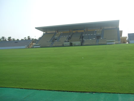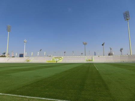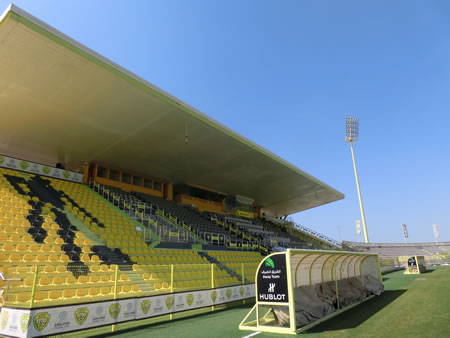 | 2013年10月23日にスタジアムを訪問。U17ワールドカップ観戦にUAEに訪れた際の試合の空き日に訪問しました。同じ最寄り駅になる、ポリス・オフィサーズ・クラブ・スタジアム編と同行程の中での訪問になりますので、そちらも参考にしてください。こちらのスタジアムは、まだドバイを鉄道が走る前の5年前に一度訪れています。部分的に、やや派手になったような印象があるものの、大部分は、その時通りだったので、足を運んだ時にすぐ思い出しました。 タクシーで行く際に、遠回りしなければならないことも含めて、懐かしかったです。 黄色基調のスタジアムで、5年前と変わらず周辺には、あまり店などがありませんでした。 | |